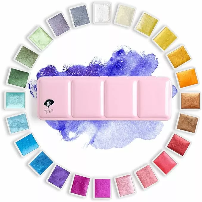 Paul Rubens – Aquarelles Métalliques & Pailletées – Set 24 Couleurs avec Boîte Rose et Palette Intégrée