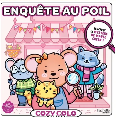 Le deuxième livre Cozy colo à paraître en mars, intitulé Enquête au Poil, se distingue par son concept original. Imaginé par l’illustratrice Lucy Queen, ce titre propose une expérience interactive où le coloriage se mêle à la résolution d’une enquête. Au fil de 30 illustrations, le lecteur est invité à suivre un fil rouge narratif et à résoudre des énigmes disséminées dans les dessins. L’histoire se déroule à Mapple Creek, un village peuplé de petits animaux attachants, et chaque page propose des détails à observer pour avancer dans l’enquête.